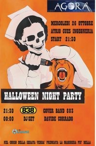 Il 26 ottobre presso l’atrio CUES di Ingegneria per festeggiare l’evento di Halloween organizzato dall’Associazione Agorà. Ospiti d’eccezione gli 838, coverband del noto gruppo 838, ed un Dj Set da PAURA con la musica selezionata rigorosamente da DAVIDE CORRADO.